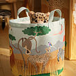 Una amplia zona de almacenaje con un bonito estampado de la sabana donde caben muchas cosas, como juguetes, toallas o ropa sucia. Es ligera pero resistente, no se vuelca y es fácil de mover mediante las asas.