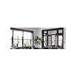 Sala de estar moderna con ventanas negras, sofá, plantas, acogedora y elegante.
