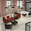 Sala de estar moderna con sofá LILLEHEM rojo, mesas de centro negras y lámparas colgantes negras.