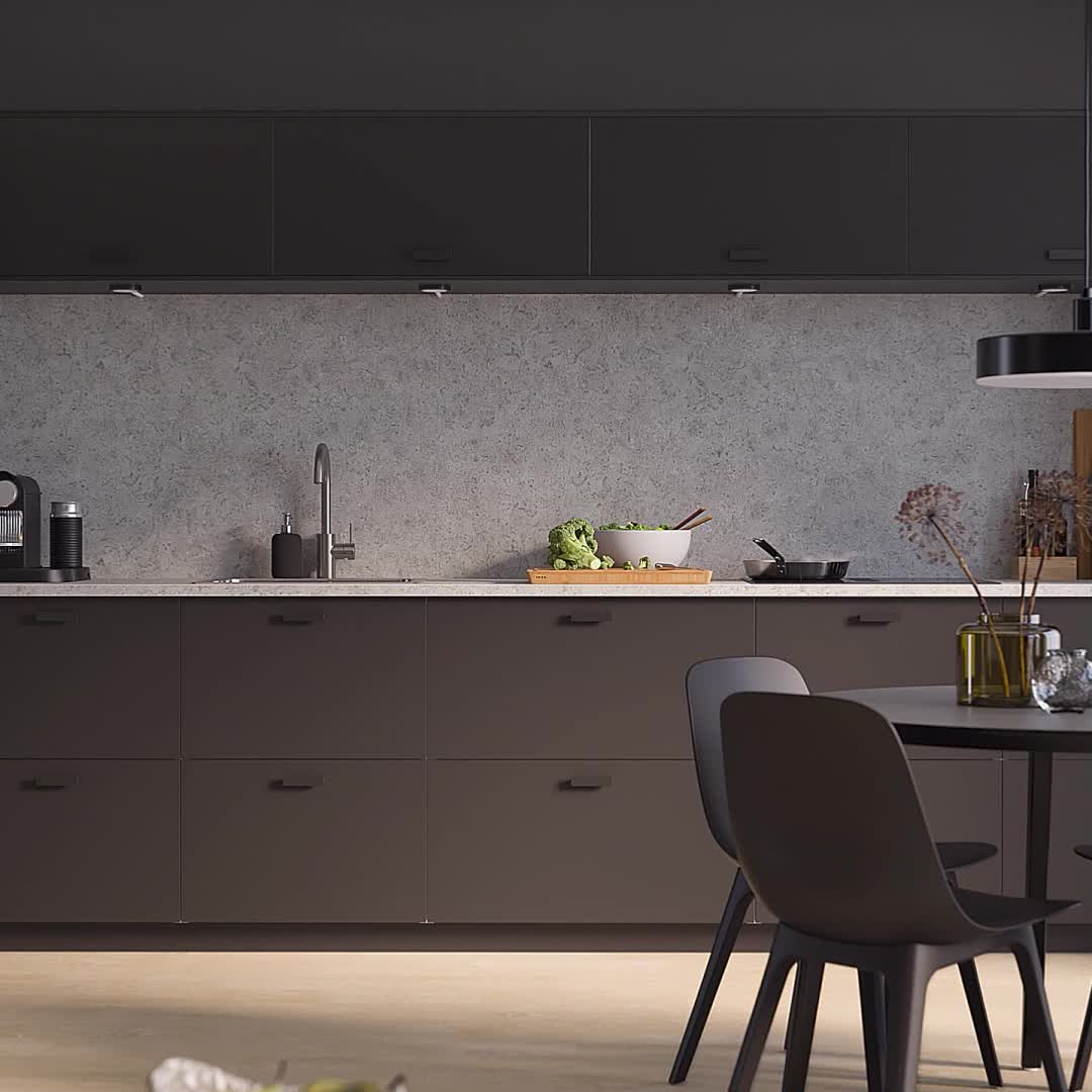 El video muestra el frente del cajón NICKEBO hecho de antracita mate, que es un color gris oscuro. El cajón tiene un aspecto moderno con su diseño plano y su acabado elegante. Parece ser parte de la configuración de un gabinete de cocina, ya que se muestra en varias posiciones dentro de diferentes ambientes de cocina. Los armarios son de color negro, complementando el color antracita mate del frente del cajón, creando una estética cohesiva y contemporánea. El video destaca la funcionalidad y el estilo del frente de cajón NICKEBO, posiblemente demostrando cómo puede mejorar la apariencia de los gabinetes o cajones de la cocina.