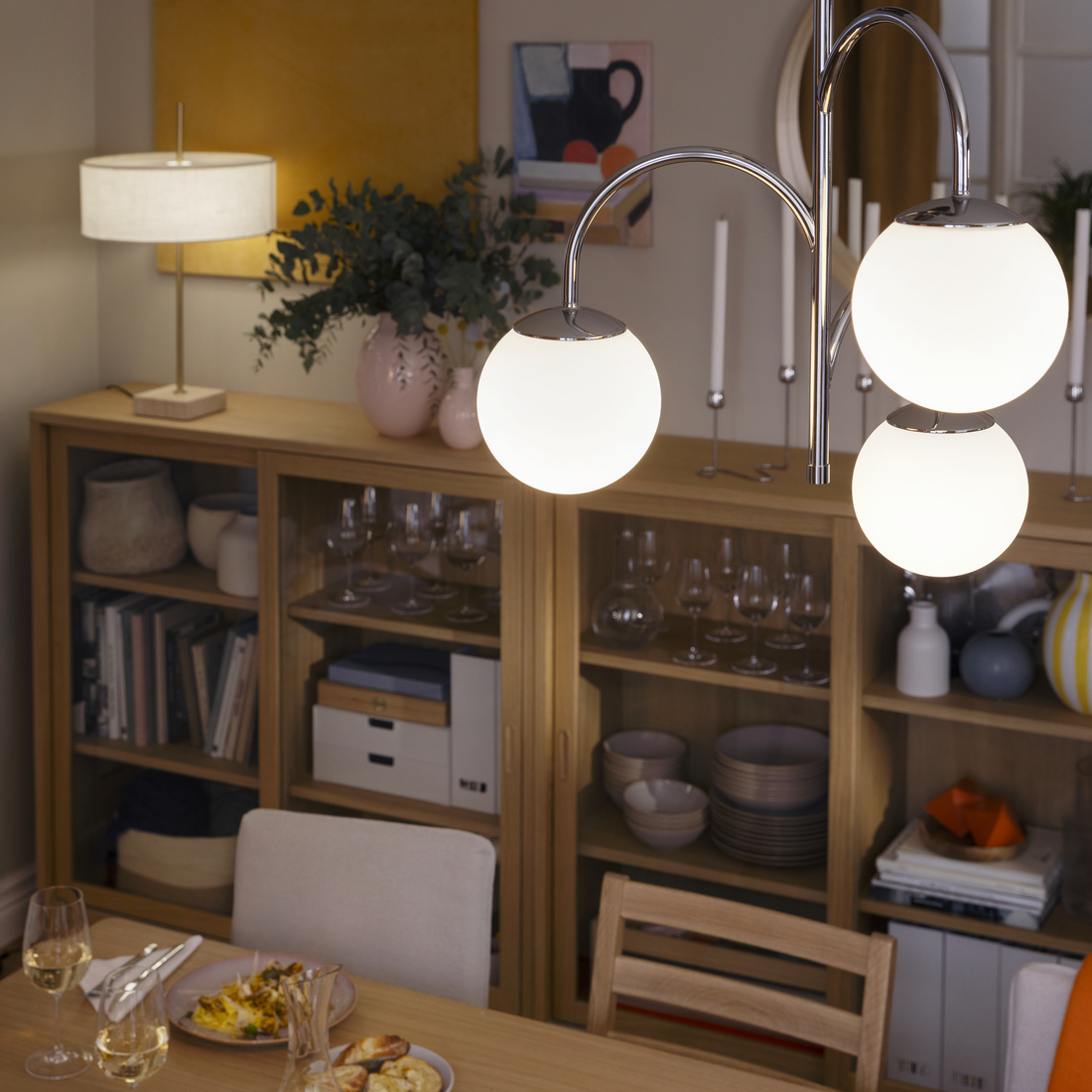 Una elegante lámpara de vidrio y cromado de la serie SIMRISHAMN. Una iluminación moderna para toda la casa que crea un ambiente agradable. Queda bien sola o combinada con otras lámparas de la misma serie.