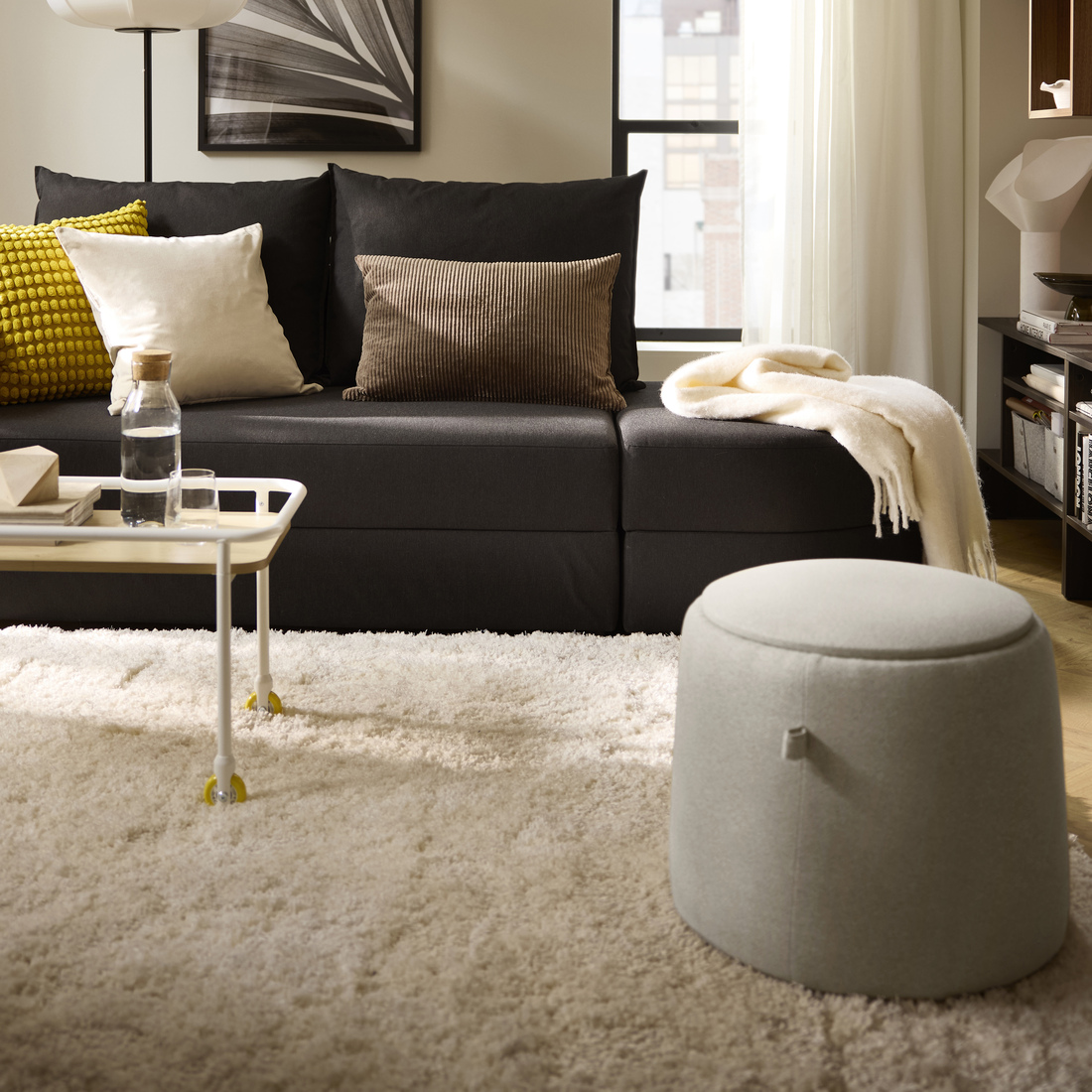 Si miras de cerca esta alfombra, verás que tiene una textura especial. Está confeccionada con hilos de distinto grosor. Esta combinación de hilos también le confiere un tacto increíblemente suave. No es raro que VOLLERSLEV le arrebate el trono al sofá y se convierta en el lugar favorito de la casa.