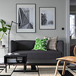 Sofá LILLEHEM gris con almohadas verdes, mesa de centro negra y plantas.