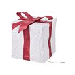 Lámpara STRÅLA de Ikea: brillante, cuadrada, papel blanco con cinta roja. Se sienta en el suelo junto a una silla acogedora.