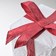 Caja de regalo blanca con un gran lazo rojo brillante atado a su alrededor.