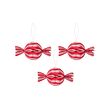 Tres panales de papel rojo y blanco, con forma de caramelo, cuelgan uno al lado del otro en un diseño festivo de piruleta.