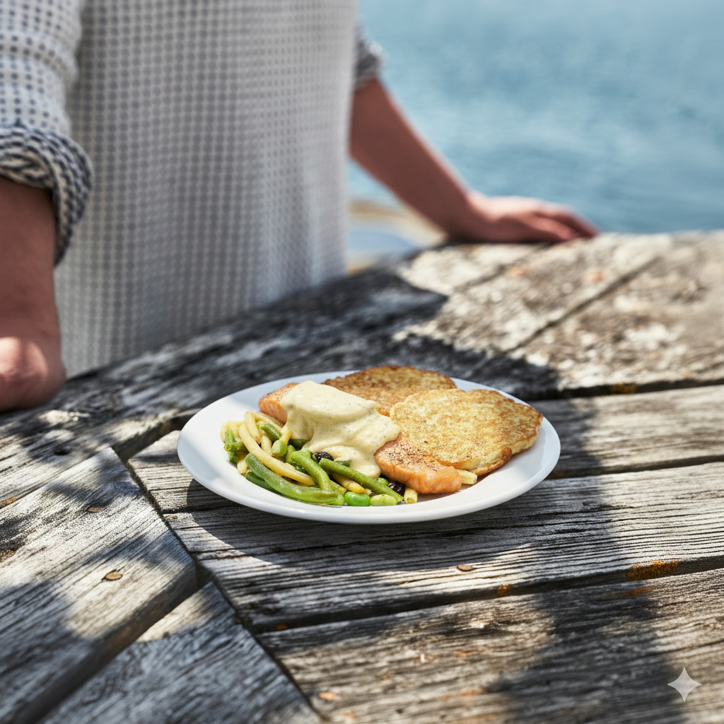 Filete de salmón asado con salsa de limón y tortitas de patata