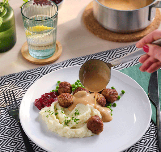 Disfruta de nuestra mermelada orgánica de arándanos rojos con albóndigas, puré de patata y salsa cremosa.