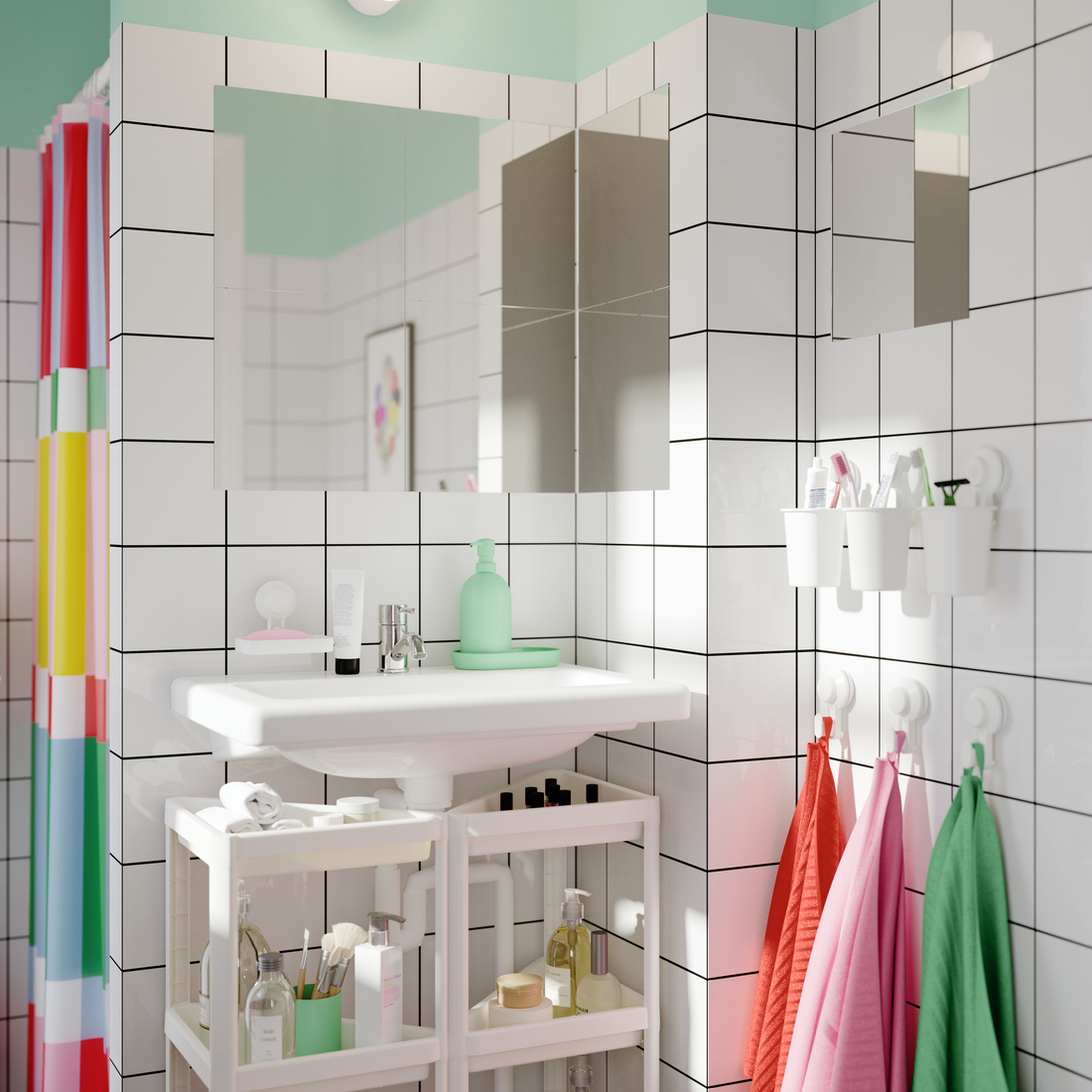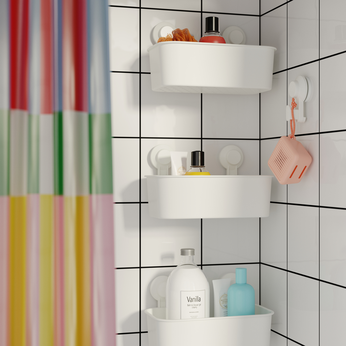 El colorido estampado de la cortina de ducha aporta un toque fresco y dinámico a tu baño.