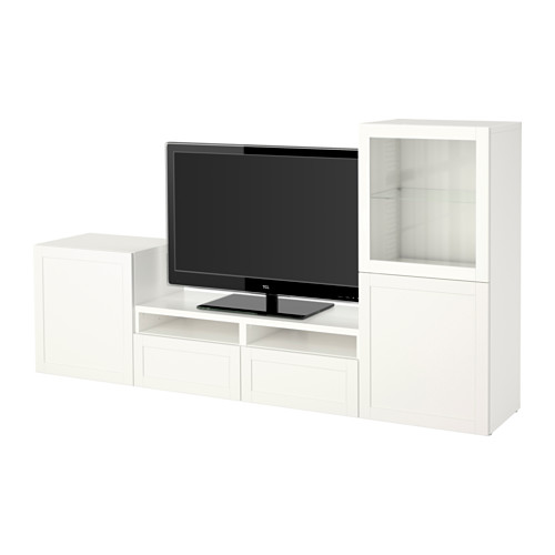 BESTÅ mueble TV con riel para cajón con cierre suave, HANVIKEN blanco / SINDVIK blanco vidrio incoloro, 240x40x128 cm