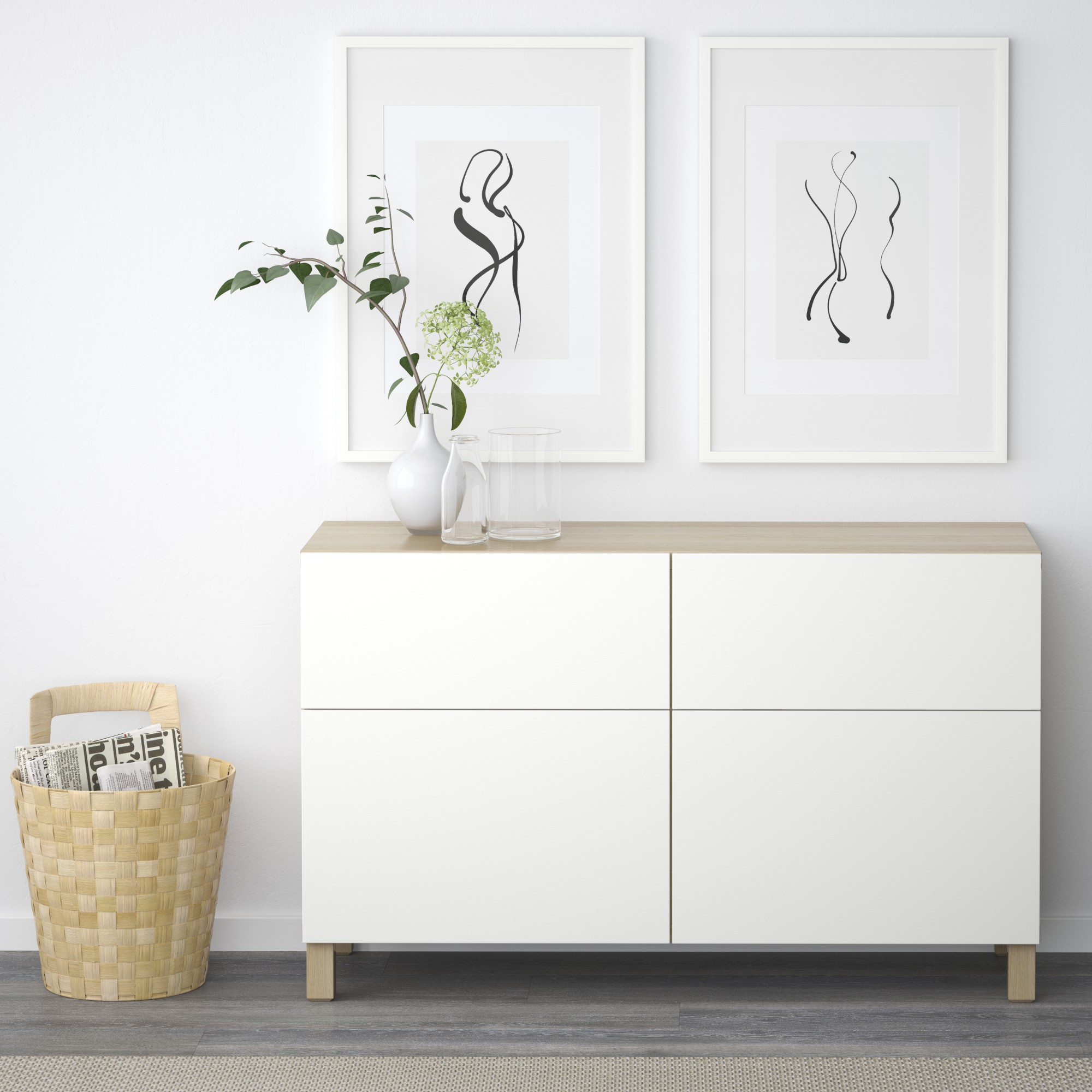 BESTÅ aparador con riel para cajón, cierre suave, efecto roble tinte blanco / LAPPVIKEN blanco, 120x40x74 cm