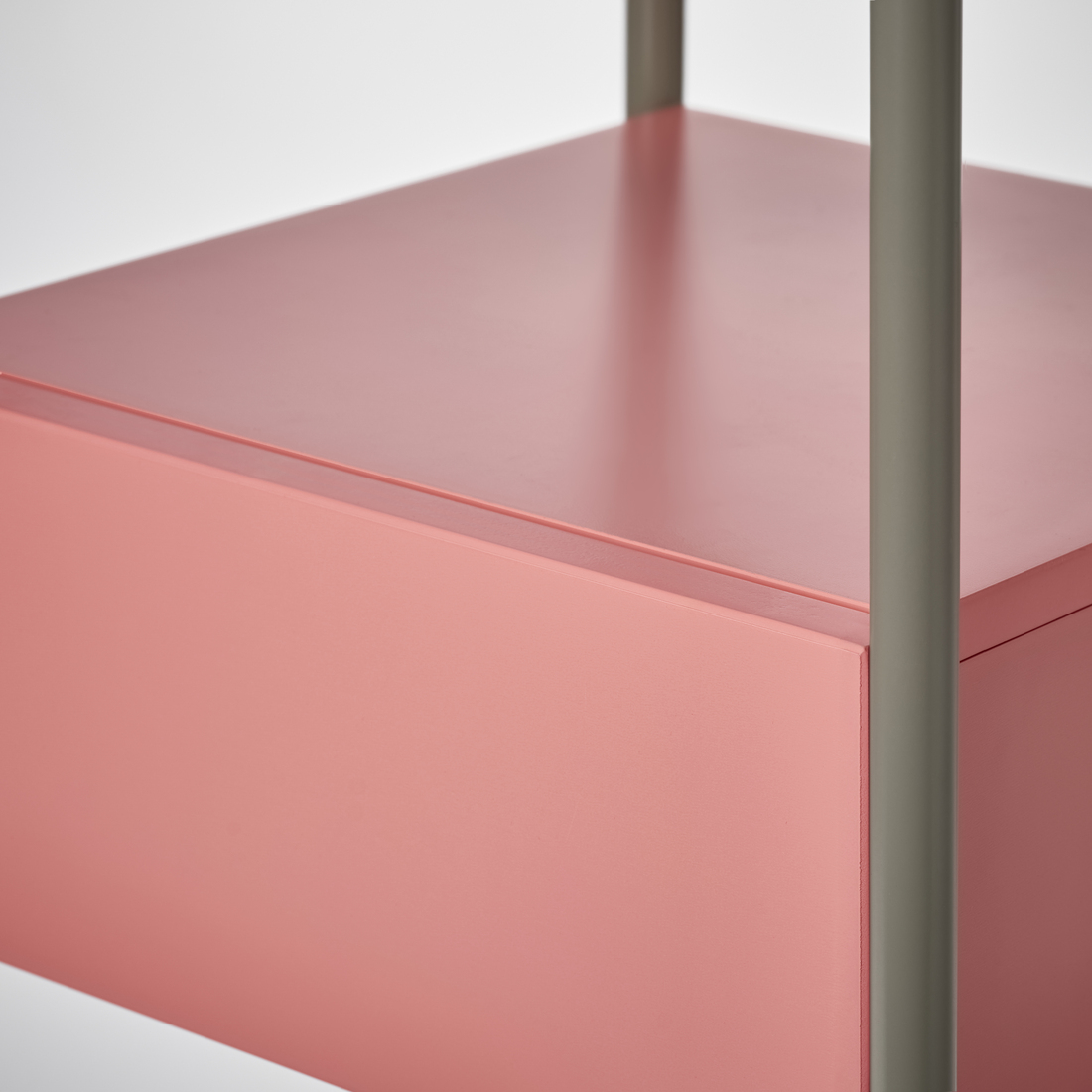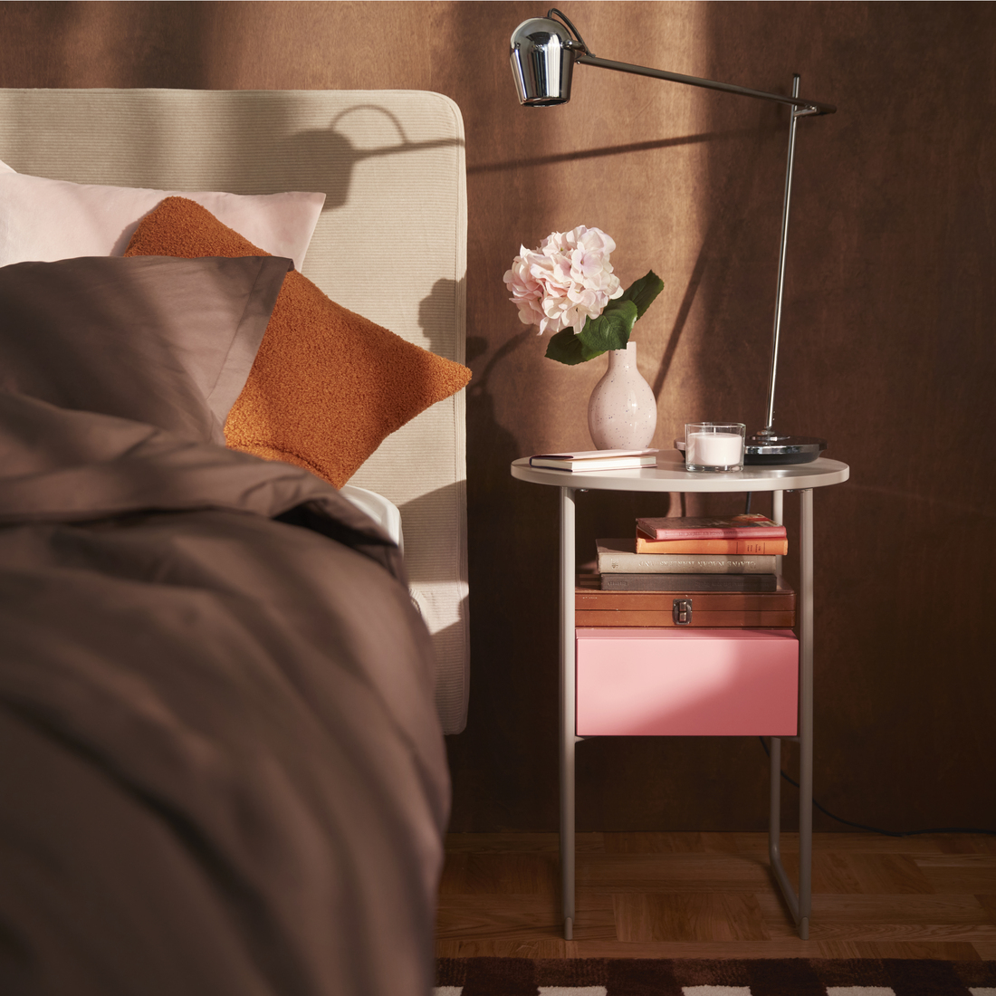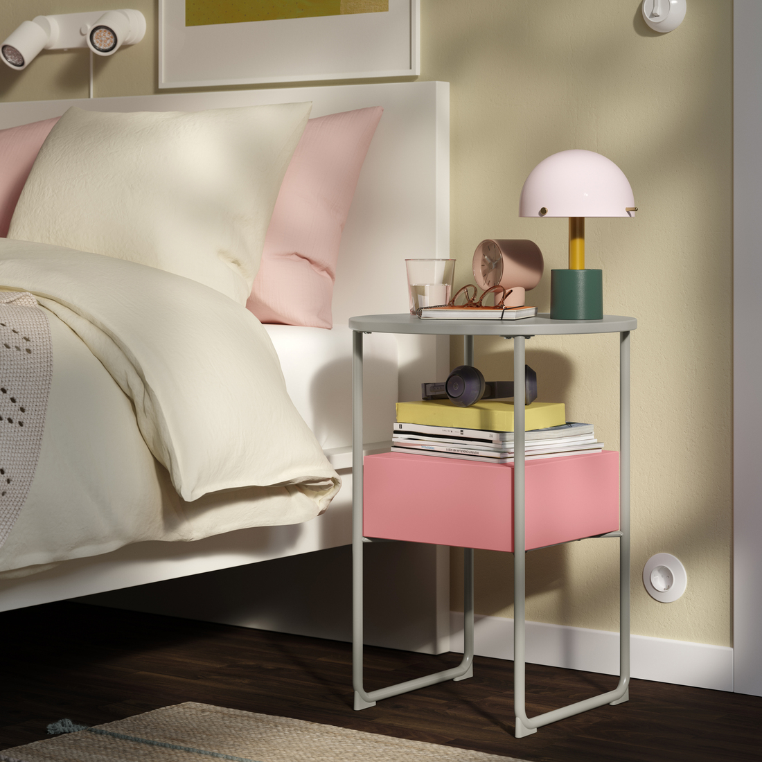 Un toque de color con un diseño inteligente. Esta mesilla de noche tiene un estilo suave, ligero y con atención al detalle. Para mantenerlo todo ordenado, guarda los objetos pequeños en el cajón y pon las cosas más bonitas en la parte de arriba.