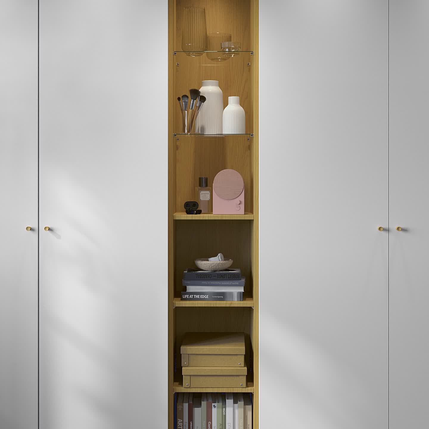 Añade esta unidad final a tu armario PAX para guardar tu ropa y accesorios favoritos a la vista. Las baldas de vidrio y madera ajustables te permitirán personalizar tu espacio.