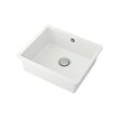 Fregadero de cocina rectangular blanco, superficie compuesta de cuarzo liso, lavabo profundo único, diseño moderno, líneas simples y limpias.