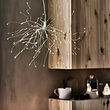 The slim brass wires with built-in lighting spread out in all directions and make the pendant lamp reminiscent of the atmospheric crackling of a sparkler when it is lit. The lamp is battery-operated.