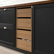 Armarios de cocina negros con tres cajones extraíbles de madera, cada uno con compartimentos incorporados, diseñados para un almacenamiento organizado.