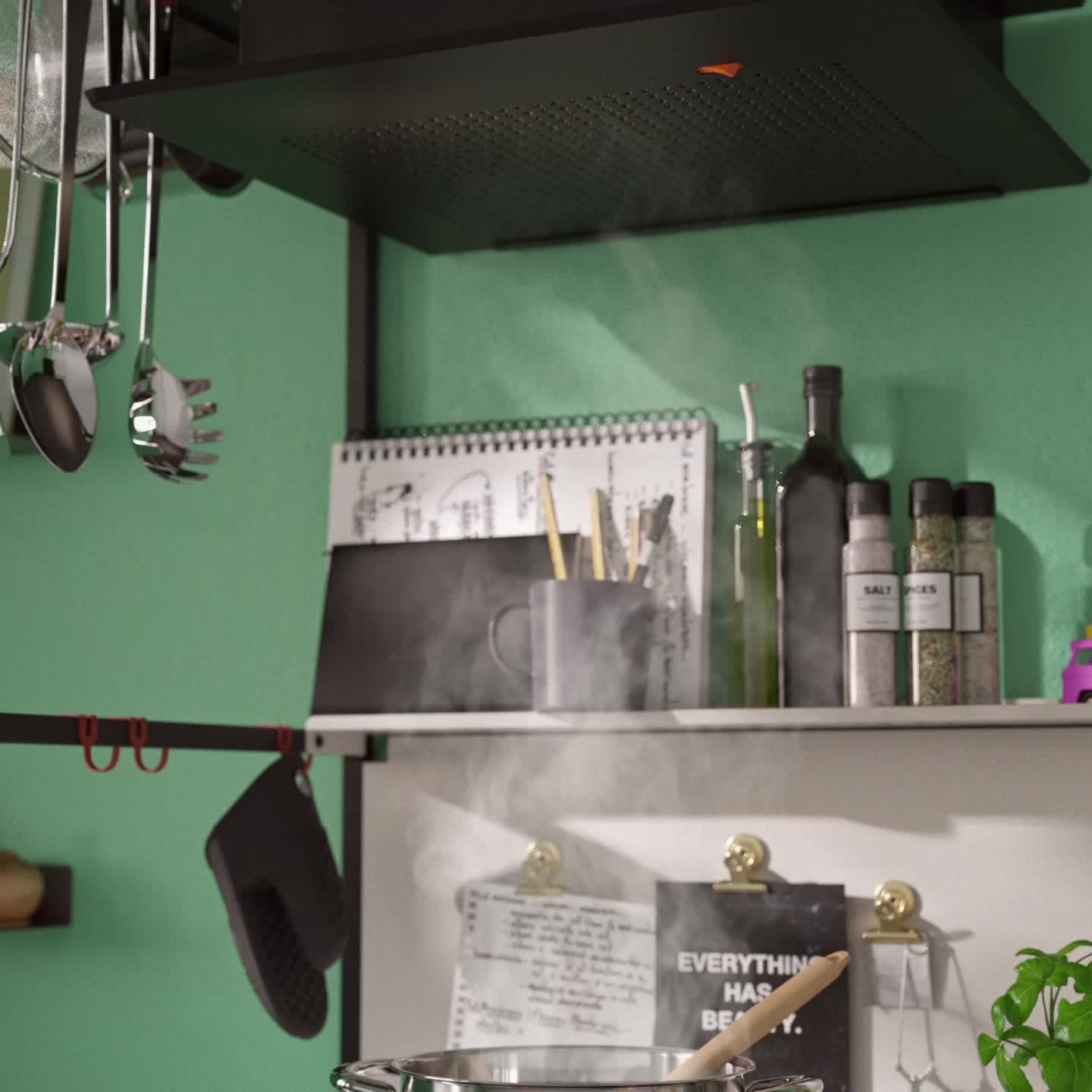 “When designing VIGGBO wall mounted extractor hood, we wanted to support people’s habits. Noting how people often use their hoods to store items and the popularity of using online recipes and recipe cards, we explored how to accommodate these behaviors. Using minimal material, we added top and bottom shelves with subtle edging so you can safely prop up your smartphone or recipe. We love how the simple construction resulted in a unique design that works on many levels.”