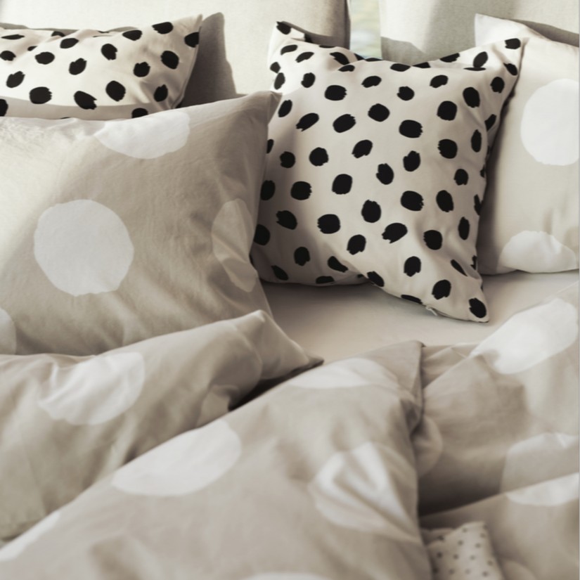 Los lunares irregulares aportan un toque alegre a esta funda de cojín. El alegre estampado en color hueso y negro lo ha creado la diseñadora Hannah Wilcox, que vive y trabaja en Londres. Queda ideal en cualquier cama, sillón o banco.