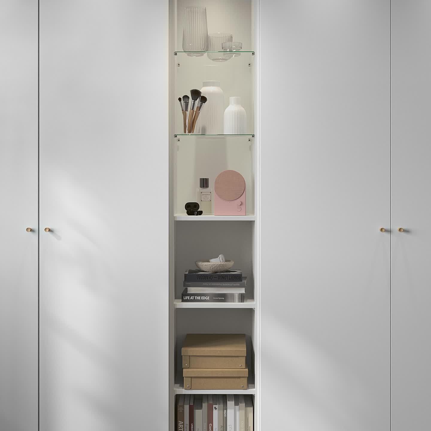 Añade esta unidad final a tu armario PAX para guardar tu ropa y accesorios favoritos a la vista. Las baldas de vidrio y madera ajustables te permitirán personalizar tu espacio.