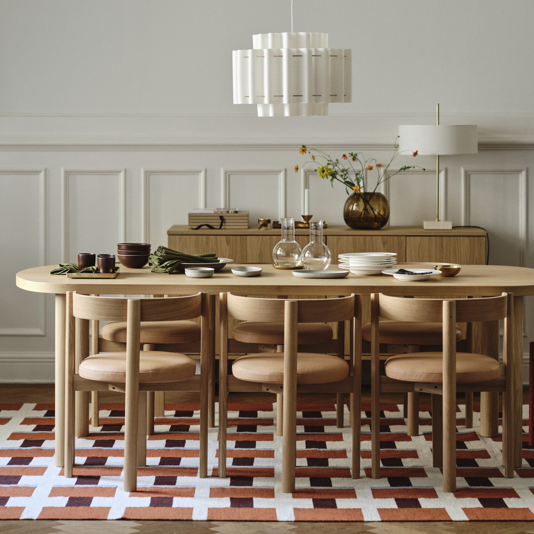 STOCKHOLM 2025 mesa y 6 sillas, chapa roble / roble piel, 230x90 cm
