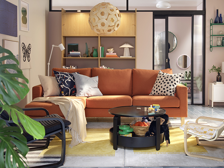 Step into this modern-style home of a family with small children and warm tones. While furnished on a budget, the living room is equipped