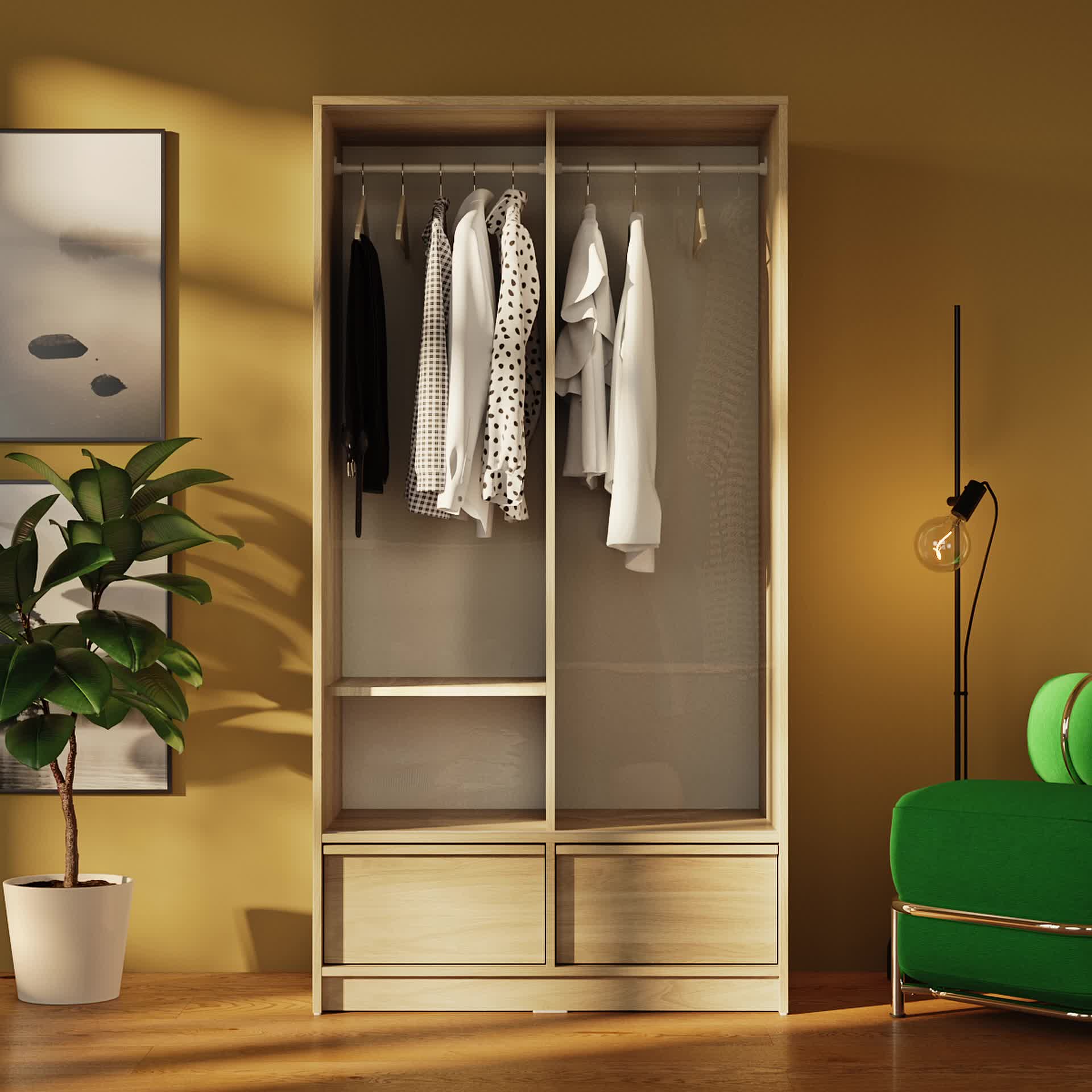 You can create one section for longer garments and one for shorter pieces by placing both shelves on the same side – or choose to position one shelf on each side.