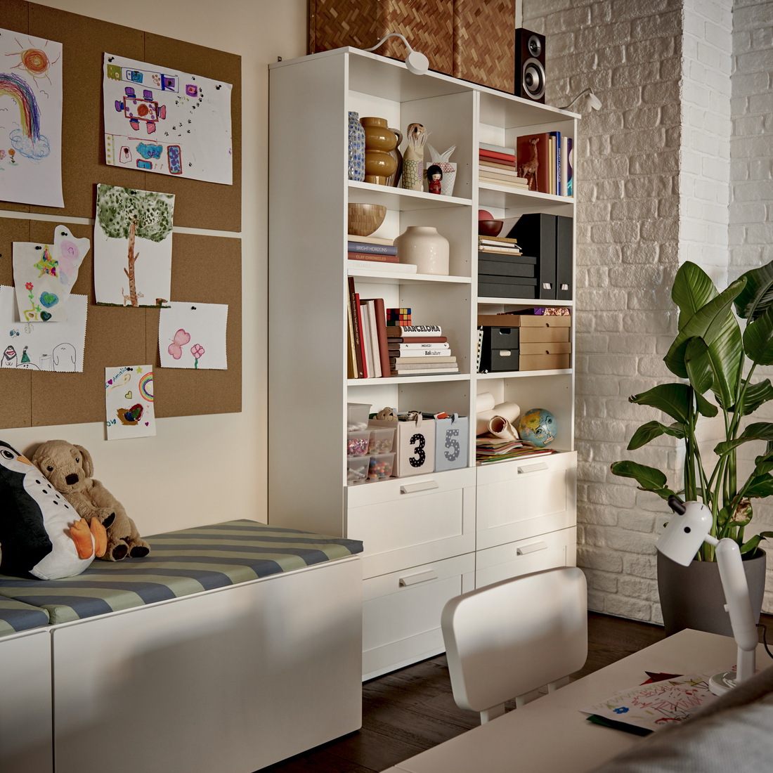 It’s easy to fit all your things into the BRIMNES series, even in smaller spaces, wherever you want in your home. You can combine the chests , wardrobes, and other furniture as you like, and even the beds have clever storage solutions.