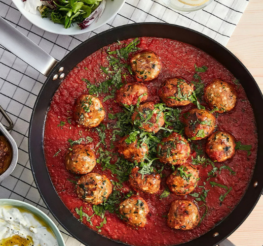 ¿Quieres un trocito de Grecia? Prueba estas jugosas albóndigas con queso feta, una rica salsa de tomate y acompañamientos típicos mediterráneos.