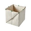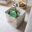 Un contenedor de almacenamiento GREJSIMOJS, de color crema, de forma cuadrada, con material de tela y acentos verdes.