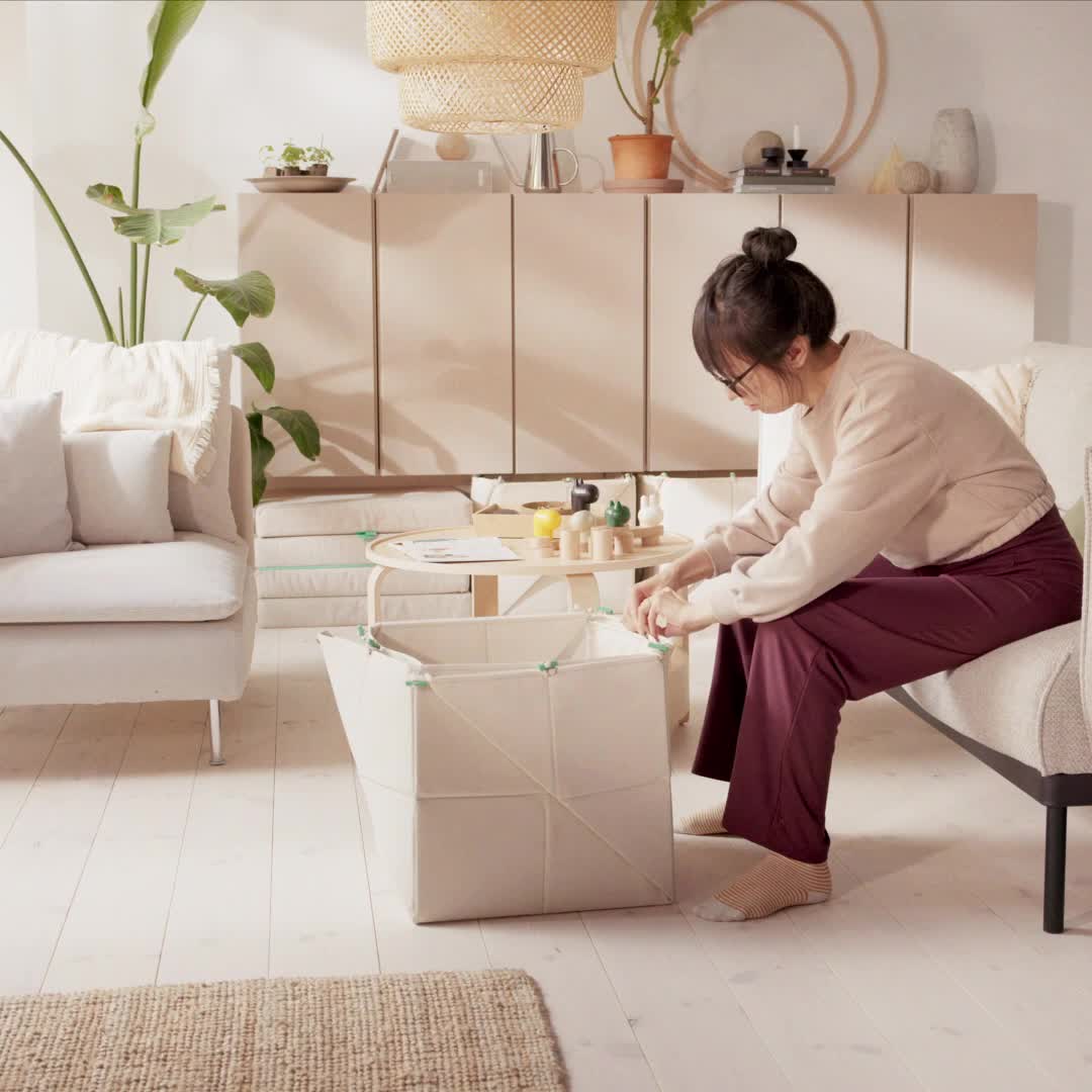 Despliégala en forma de alfombrilla suave y acogedora para jugar o dóblala como caja para guardar juguetes y otras cosas pequeñas. La alfombrilla puede tener tres formas diferentes y, gracias a los prácticos cierres con ojales, es muy fácil cambiarla.