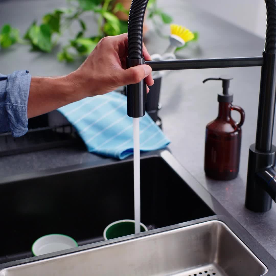 La funcionalidad de pulverización doble te permite alternar entre el chorro normal, para cosas como llenar las ollas, y el modo de pulverización, para fregar los platos.