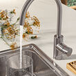 Grifo de cocina de cuello de ganso con un arco alto y aireador que genera un chorro suave que favorece la conservación del agua.