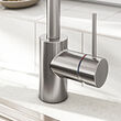 Este grifo de acero inoxidable presenta un elegante diseño de cuello de ganso que realza cualquier cocina moderna. El aireador del grifo genera un chorro suave que evita el despilfarro de agua.