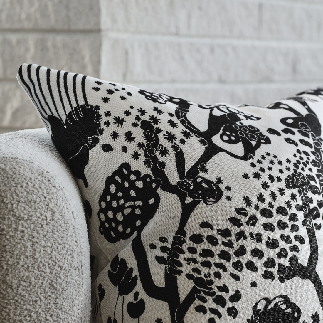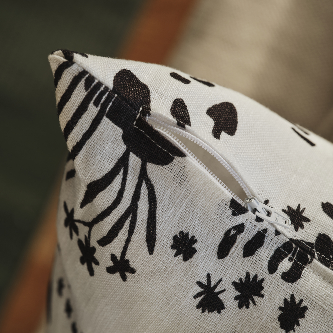 Funda de cojín de lino con un estampado impreso en blanco y negro, inspirado en la naturaleza, que te llevará a los maravillosos bosques del norte. Forma parte de la colección IKEA STOCKHOLM 2025, que es todo un homenaje al diseño escandinavo.